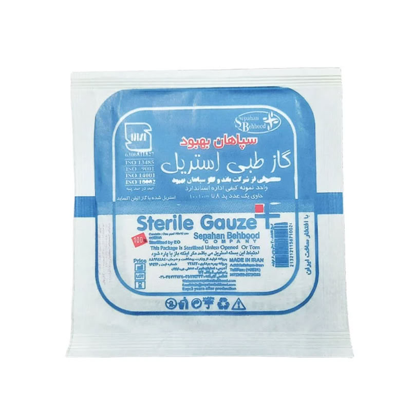 گاز استریل سپاهان بهبود ابعاد 10 در 10 سانتی متر - 8 لایه پنبه طبیعی - استریل شده با اتیلن اکساید - جذب خون و ترشحات فوق العاده - بدون پرز