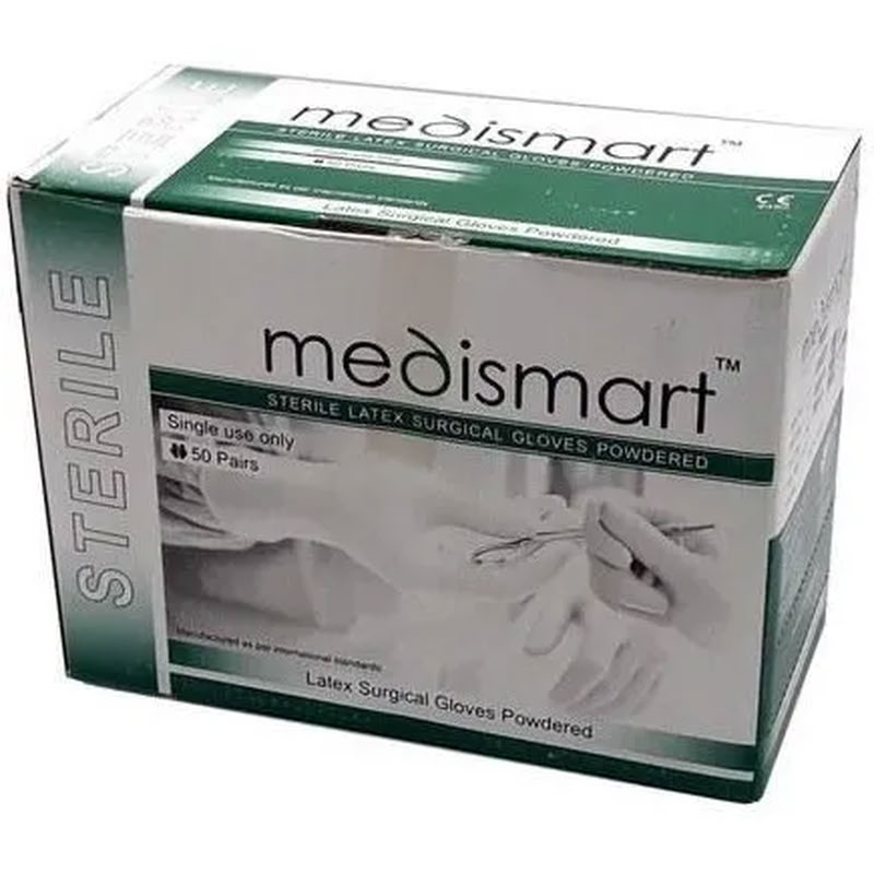 دستکش جراحی استریل مدی اسمارت MediSmart سایز 8 - پودر دار (Lightly Powdered) - لاتکس طبیعی با حس لامسه فوق العاده - بسته 50 جفتی - گرید اتاق عمل