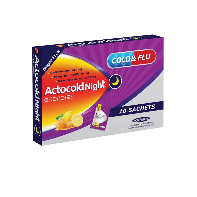 شبها بدترین زمان سرماخوردگی است؛ سرفه امان نمیدهد و بینی کیپ میشود. **ساشه اکتوکلد شب (Actocold Night)** دقیقاً برای همین لحظات طراحی شده است. این محصول یک نوشیدنی داغ دارویی با طعم لیمو و عسل است که نه تنها تمام علائم سرماخوردگی را قطع میکند، بلکه با ایجاد یک خواب عمیق و راحت، به بدن فرصت بازسازی میدهد.