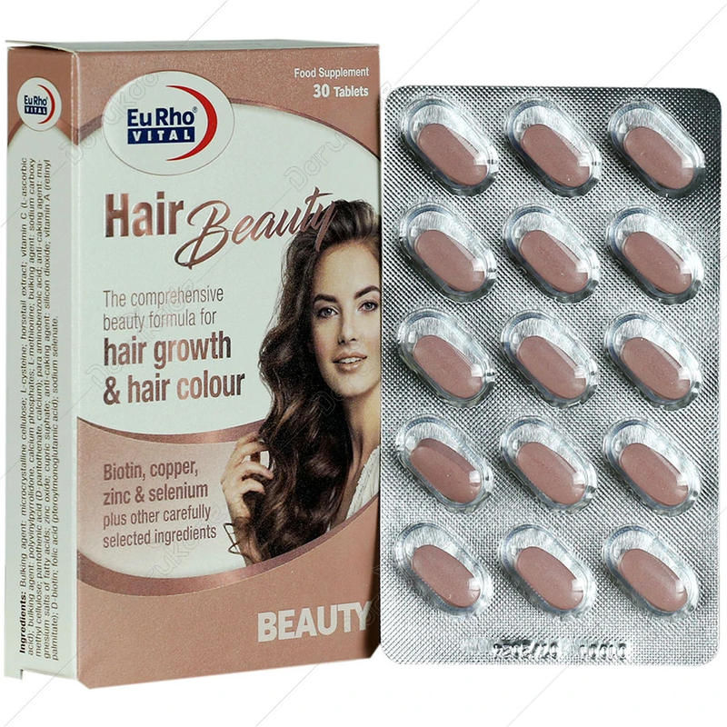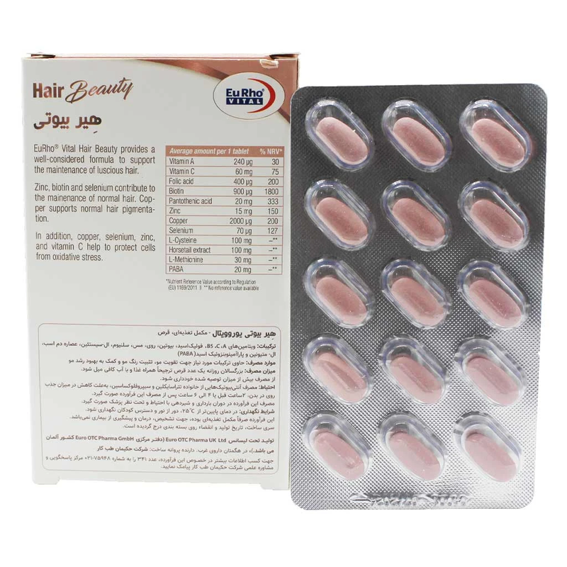 قرص هیر بیوتی یوروویتال (Eurho Vital Hair Beauty) | 30 عدد | مکمل تخصصی قطع ریزش مو و ضخیم سازی تار مو | حاوی سیستین و متیونین | تحت لیسانس آلمان