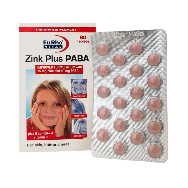 قرص زینک پلاس پابا یوروویتال (Eurho Vital Zinc Plus PABA) | 60 عدد | تخصصی برای پیشگیری از سفیدی مو | رفع لک و تیرگی پوست | تحت لیسانس آلمان