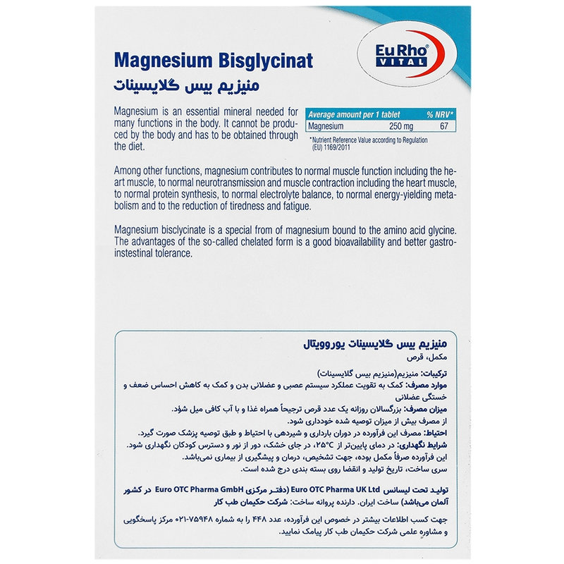 قرص منیزیم بیسگلیسینات یوروویتال | جذب فوقسریع برای خواب و عضله 60 تایی