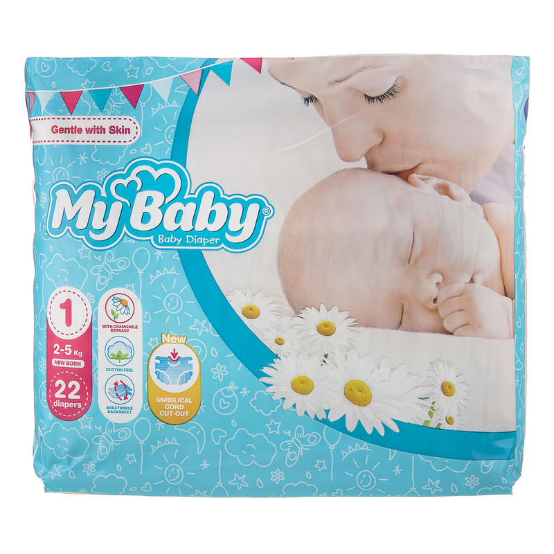 مای بی بی (My Baby) - پوشک بچه سایز 1 (Newborn/نوزادی) - بسته 22 عددی - مناسب 2 تا 5 کیلوگرم - دارای انحنای بند ناف و بافت پنبهای
