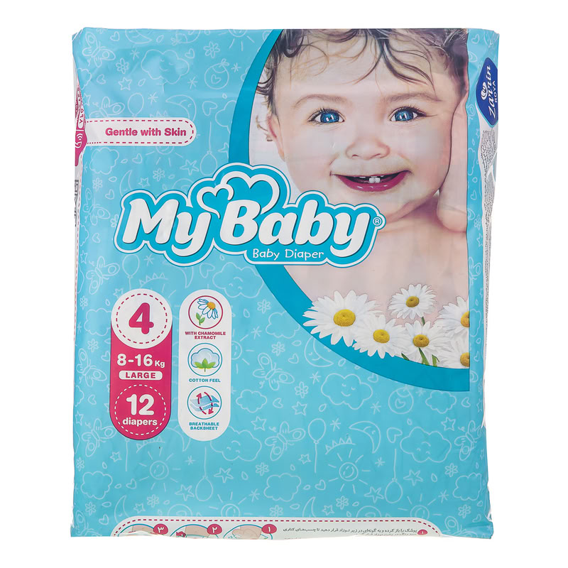 مای بی بی (My Baby) - پوشک بچه سایز 4 (Large/بزرگ) - بسته 12 عددی - مناسب 8 تا 16 کیلوگرم - کشسانی بالا و لوسیون محافظ