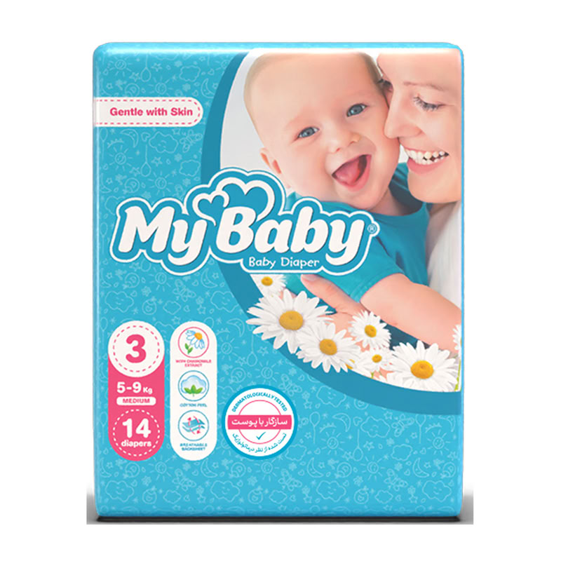 مای بی بی (My Baby) - پوشک بچه سری مهربان با پوست - سایز 3 (Midi/متوسط) - بسته 14 عددی - حاوی لوسیون بابونه - مناسب 5 تا 9 کیلوگرم